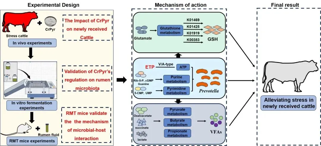 在我国“北繁南育、北牛南调”的肉牛产业大格局下,新进牛在长途运输及过渡期面临禁食、环境突变、饲料转换等多重应激,极易导致生长阻滞与疾病发生,每年造成的经济损失巨大。团队前期研究揭示了新进牛应激过渡期瘤胃微生物与机体互作动态变化规律(《Microbiome》,2023),并发现补充CrPyr能有效缓解新进牛应激,但其作用机制尚不清楚。因此,本研究通过宏基因组学与代谢组学联合分析,并结合体外发酵及伪无菌小鼠瘤胃菌群移植(RMT)模型,深度挖掘CrPyr介导微生物群落代谢以保障宿主健康的因果链条。