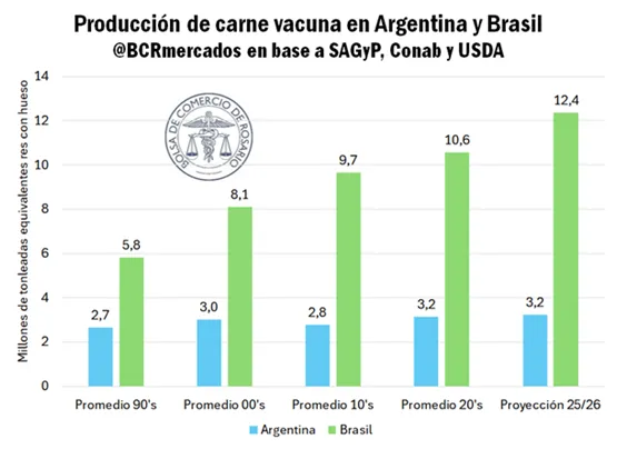 在2010年代初期,巴西的肉类综合产量是阿根廷的三倍多,比阿根廷高出249%。本世纪25年里,这一差距是持续扩大,巴西的肉类总产量平均高出阿根廷235%。美国农业部预测,到2025/26年度,巴西的肉类产量将高出阿根廷284%,几乎近四倍。