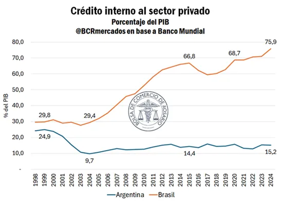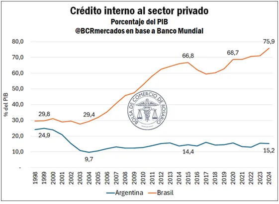 造成这种行业绩效差距的部分原因在于巴西农业获得了更多的融资。本世纪初,阿根廷和巴西的私营部门国内信贷水平相对接近,分别占GDP的24%和31%。二十五年后,两国的发展轨迹呈现显著差异。阿根廷的这一指标从未恢复到2001年危机前的水平,到2024年仅为15%,而巴西则经历了持续增长,达到了GDP的近76%。因此,25年前两国私营部门融资占经济规模比例的7个百分点差距,如今已扩大到60多个百分点。
