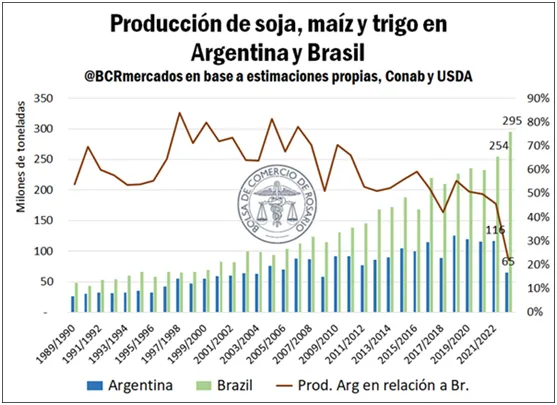 然而,此后十年间,出口税重新生效,相关的政策开始减少对农业供应链的支持。这种情况下,巴西继续通过诸如萨夫拉计划等举措来支持本国农业生产。巴西的耕地面积和单产增长速度均超过阿根廷,到2010年代,巴西的产量已比阿根廷已高出82%。近来,这一差距持续扩大,2020年代前五个季度,巴西的产量比阿根廷高出155%。巴西农业经济局(GEA)和阿根廷国家农业公司(Conab)对2025/26年度大豆、玉米和小麦的收成预测显示,两国产量差距将达到147%。