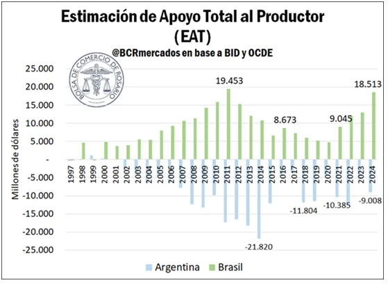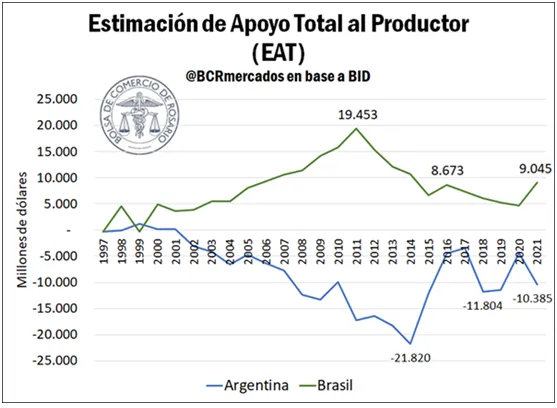 阿根廷和巴西之间的关键区别就在于此:2002年至2021年间,阿根廷政府从农业和农业综合企业撤资近2000亿美元。与此同时,根据美洲开发银行(IDB)的数据,巴西农业部门获得了约1900亿美元的正面支持。