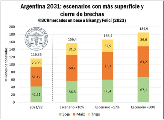在缩小差距的中间方案中,如果单产提高17%,并纳入新增的650万公顷林地(遵守阿根廷现行林业法),仅就大豆、玉米和小麦而言,阿根廷的产量就可能增加4400万吨以上。按当前价格计算,这相当于每年增加价值130亿美元的离岸价(FOB)。值得注意的是,还可以对向日葵、大麦和高粱的价值链进行进一步分析。
