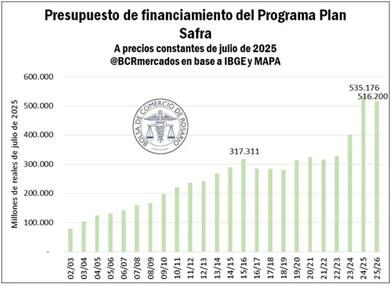 该计划下的农村信贷总额从2000/01年度(当时称为“农业和畜牧业计划”)的130亿雷亚尔增长到2025/26年度的超过5160亿雷亚尔,25年间实际增长超过六倍。2025 /26年度的预算约合940亿美元。过去几十年来的这一增长得益于一系列举措,包括推出新的税收减免政策、提高私营部门的参与度、实施长期投资计划以及增强制度的可预测性。