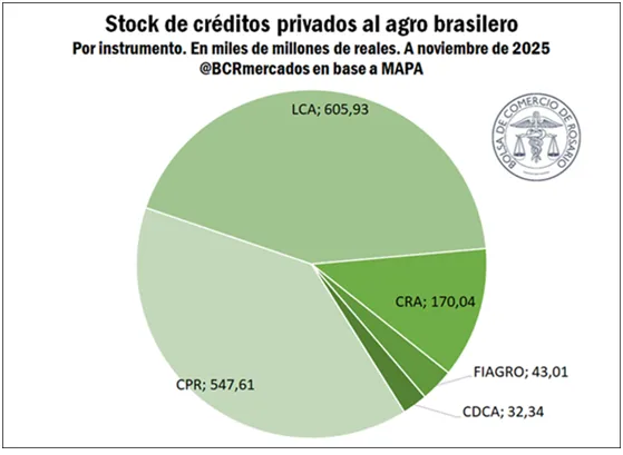 巴西还存在其他重要的私人信贷机制,这些机制均由制定《农业信贷法》(LCA)的同一法律所创设。在这方面,农业合作社和其他参与产品、投入品、机械等销售、加工或工业化的企业可以发行农业信贷权证(CDCA)。同样,如果保险公司或证券化公司担保的信贷权与农业企业相关,则可以发行农业企业应收账款凭证(CRA)。此外,根据第14.130号法律,巴西于2021年3月启动了FIAGRO(农业企业生产链投资基金)。这类公司的资产全部用于再投资,为农业企业活动提供资金,并享受所得税豁免等优惠政策。这些优惠政策有助于通过资本市场加大对巴西农业企业的投资。截至2025年10月,巴西农业私人信贷总额将接近1.4万亿雷亚尔,相当于超过2540亿美元。