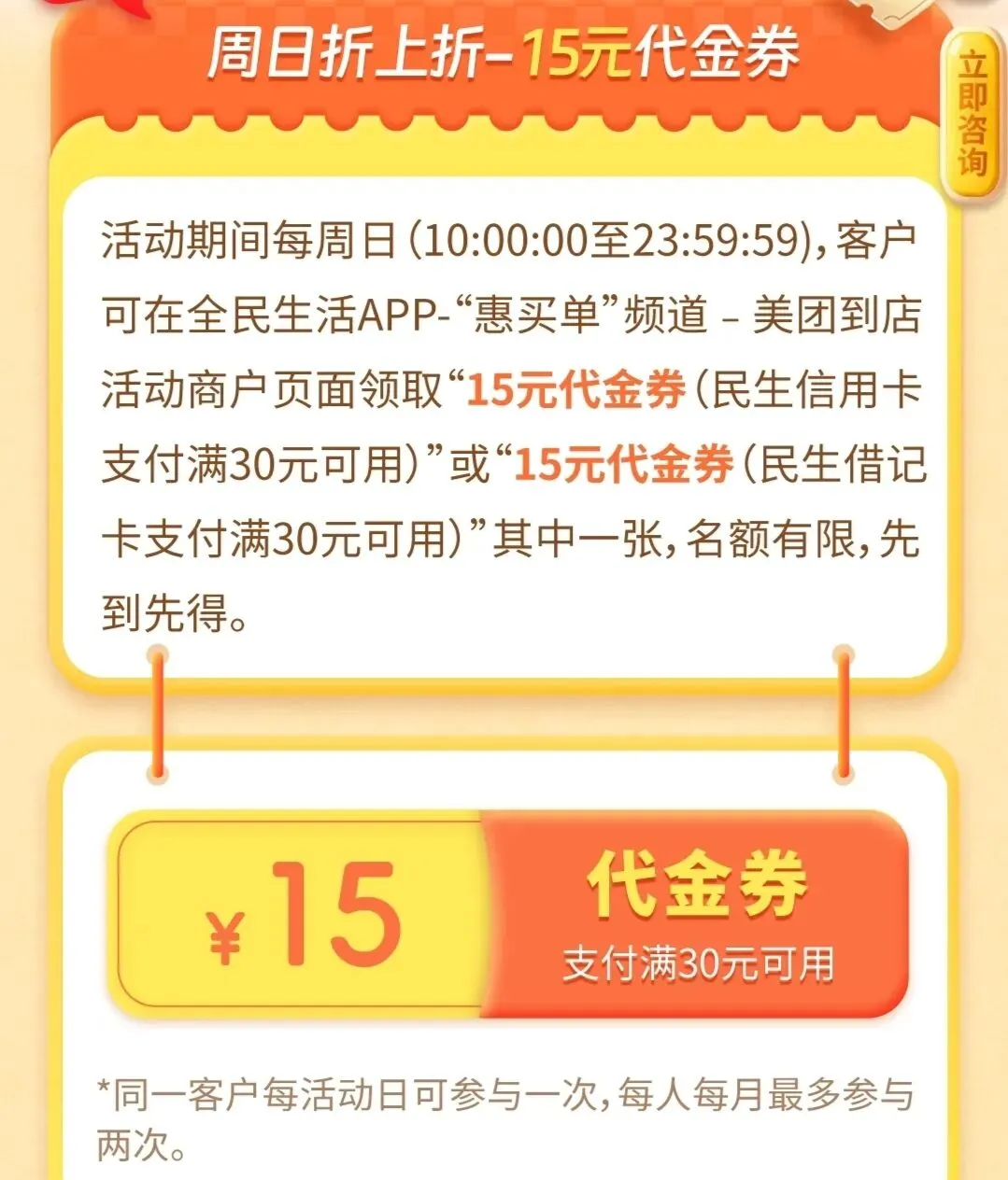 每周日10点,抢券:美团到店30-15,月限2次