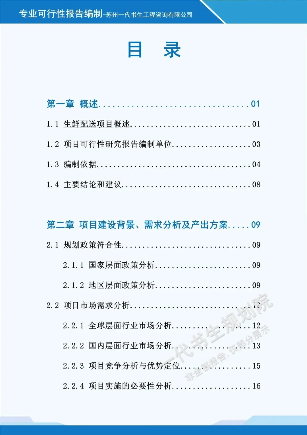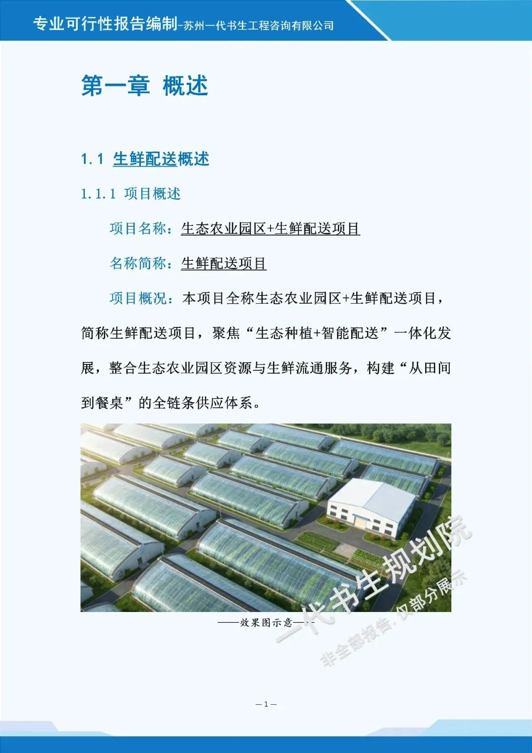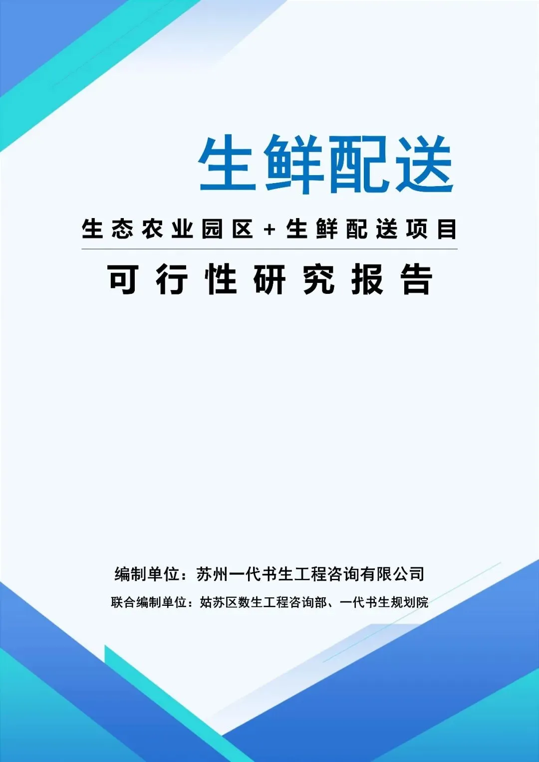 以下是《生态农业园区+生鲜配送项目可行性研究报告》的案例展示,该项目可行性报告编制公司为苏州一代书生工程咨询有限公司。项目可行性研究报告编制、项目计划书编写,请联系:17312436919。以上生鲜配送基地建设项目可行性研究报告是由苏州一代书生工程咨询有限公司出具。苏州一代书生工程咨询有限公司,是集市场评估、产业策划与规划设计于一体,可为项目提供建设前期评估、落地规划设计,出具成果有:《行业市场调研分析报告》、《项目建议书(项目计划书)》、《项目可行性研究报告》、《项目初步设计方案》、《项目概念规划设计方案》、《项目建设总体规划设计方案》、《地区/片区/项目总体产业发展规划方案》等。