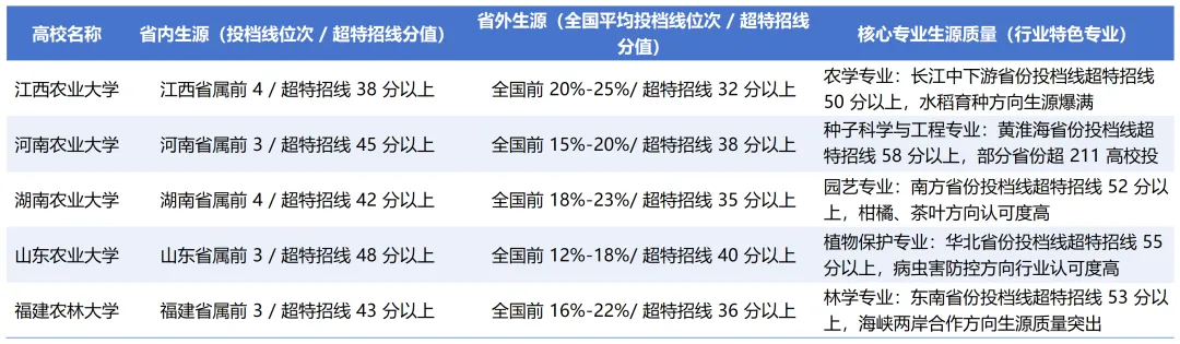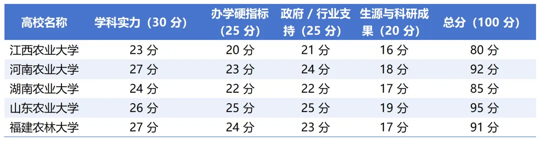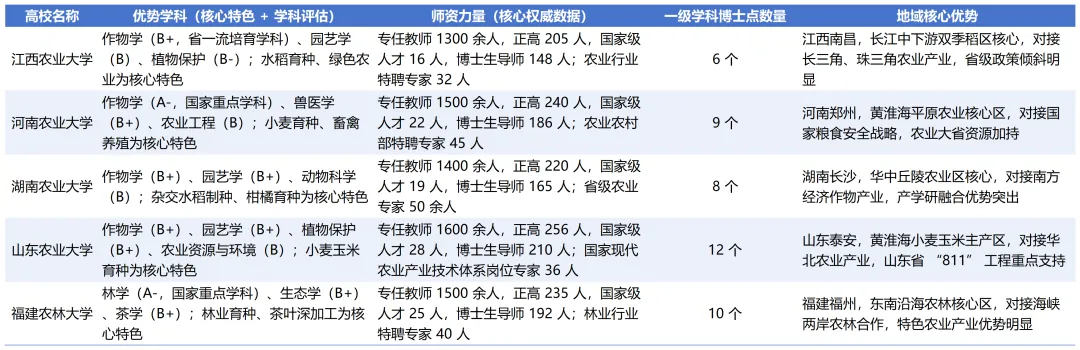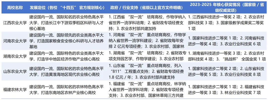省级政府的双一流培育政策是核心加分项,山东农业大学被山东省列为 “双一流重点培育高校”,纳入 “811” 工程重点支持,省财政每年安排 1.8 亿元专项经费,政策支持力度最大;河南农业大学同样为省级重点培育高校,获 2 亿元 / 年专项经费,且为三方共建高校,行业资源加持明显;福建农林大学、江西农业大学、湖南农业大学均为省级重点培育或培育高校,福建农林的林学、江西农大的作物学获专项培育,但整体支持力度稍逊于前两者。