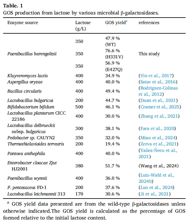 目前商业化生产GOS的方法主要是利用β-半乳糖苷酶催化乳糖或乳清发生转糖基反应生成GOS。该方法因其反应条件温和、操作简单、效率高等优点,是一种有效且适合大规模生产的方法。β-半乳糖苷酶在食品加工业中具有双重作用:作为水解酶,它能催化牛奶中乳糖的分解;而作为转半乳糖基酶,它能生产具有不同聚合度的GOS。在这两种应用中,具有优异转糖基效率的β-半乳糖苷酶都备受青睐。目前,已从微生物源中鉴定和表征了许多β-半乳糖苷酶,包括细菌和真菌,如乳酸克鲁维酵母、米曲霉和环状芽孢杆菌。然而,这些来源的GOS产率很少超过50%。这个生产水平不足以满足工业化规模、高效生产GOS的需求,因此需要进一步提高。