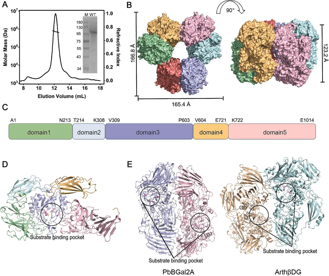 电镜密度图的质量能够以 AlphaFold2 预测的模型为模板,重建完整的原子模型。结构分析表明,PbBGal2A 在最终模型中形成一个六聚体,其长度为 165.4 Å,宽度为 123.2 Å,高度为 166.8 Å(图 1B),这一发现与通过 SEC-MALS 在溶液中观察到的寡聚状态一致(图 1A)。所有六个链中都缺失了 395–405、472–482 和 709–718 残基,表明这些区域具有柔性。该六聚体结构由三个同源二聚体组装成一个桶状结构。每个单体由 1014 个残基组成,并折叠成五个结构域(图 1C 和 D):结构域 1(A1-N213)、结构域 2(T214-K308)、结构域 3(V309-P603)、结构域 4(V604-E721)和结构域 5(K722-E1014),这与其他已报道的 GH2 家族 β-半乳糖苷酶中观察到的结构相似。中心的 TIM 桶状结构域(结构域 3)由八个平行的 β 链和八个 α 螺旋组成,其中包含催化残基 E443 和 E514。构成催化口袋的残基主要来自催化结构域 3。在 PbBGal2A 结构中,一个覆盖活性位点的长环插入片段(残基 472–482)不可见。在其他 β-半乳糖苷酶结构中,该环的 B 因子高于整体平均值,并在催化过程中经历构象变化。此外,辅助结构域 1 和 5 也对催化口袋有贡献,其环区(来自结构域 1 的残基 95–100 和来自结构域 5 的残基 984–988)构成了活性腔的入口。