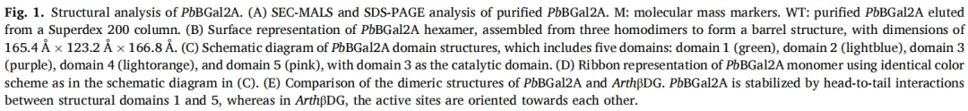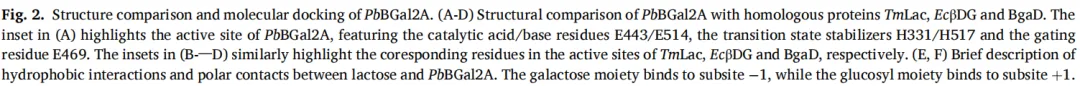 随后,通过 DALI 服务器对 PbBGal2A 单体结构进行分析,以识别结构上最接近的蛋白质。按降序排列的匹配结果包括:来自海栖热袍菌 MSB8 的 β-半乳糖苷酶(TmLac,PDB ID: 6SD0,Z 得分为 44.3,RMSD 为 1.6 Å)、来自多形拟杆菌 VPI-5482 的 β-半乳糖苷酶(PDB ID: 3DEC,Z 得分为 44.6,RMSD 为 2.0 Å)和来自大肠杆菌 K-12 的 β-半乳糖苷酶(PDB ID: 7BTK,Z 得分为 44.2,RMSD 为 1.8 Å)。所有这些结构都属于 GH2 家族,具有相似的结构域排列。然而,它们的寡聚组装方式不同,这可能是由于某些环区的微小变异可能导致完全不同的寡聚体排列和底物特异性(图 1E)。寡聚结构的形成对于 GH2 家族 β-半乳糖苷酶的功能至关重要。