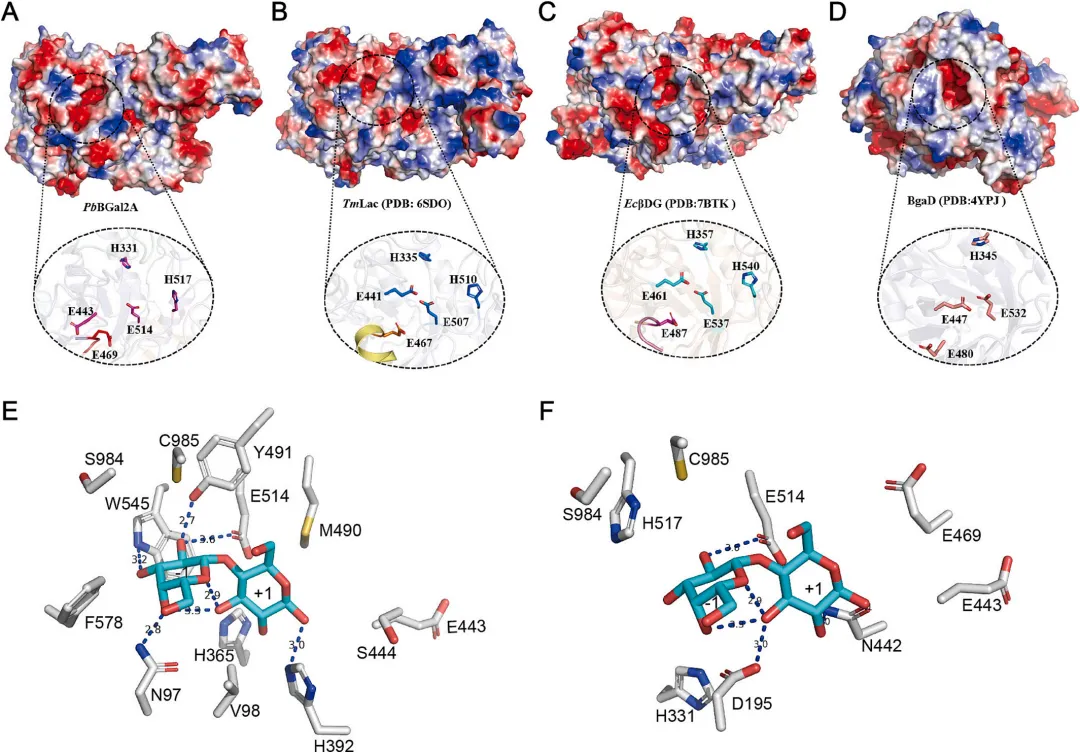 GH2家族β-半乳糖苷酶遵循通用的双置换催化机制,其中E514作为亲核试剂,E443作为酸碱催化剂。在GOS合成反应中,亲核试剂攻击乳糖的半乳糖基部分,形成共价的酶-底物中间体并释放葡萄糖基单元。随后,另一个乳糖分子作为半乳糖基受体,在酸碱催化剂通过去质子化作用的促进下,半乳糖基被转移到受体上。尽管E514是严格保守的,但与TmLac(PDB: 6SD0)、EcLac(PDB: 7BTK)和BgaD(PDB: 4YPJ)结构中的对应残基相比,PbBGal2A结构捕获了E443的翻转构象,表明在催化过程中酸碱催化剂发生了侧链翻转机制(图2A-D)。这种构象还导致在传统催化腔下方形成了一个额外的溶剂可及裂缝,该裂缝主要由酸性氨基酸组成。该腔体强烈的酸性特征促进了碳水化合物底物的结合,其扩大的体积可能使得更大的半乳糖基受体能够更有效地结合,并增强产物的解离。因此,与EcLac和TmLac相比,PbBGal2A实现了更高的GOS转化率。此外,来自环状芽孢杆菌ATCC 31382的BgaD表现出更扩展的催化口袋,这与其高转糖基能力相关,其GOS最高产率达到63.5%(图2D)。残基H331和H517被认为起着稳定过渡态的作用。与同源的GH2家族β-半乳糖苷酶相比,H331在结构上是保守的,而位于催化口袋入口处的H517,其侧链发生了约90°的旋转。此外,门控残基E469的构象变化,其特征是其侧链远离活性中心移动,导致催化口袋入口扩大且酸性增加。