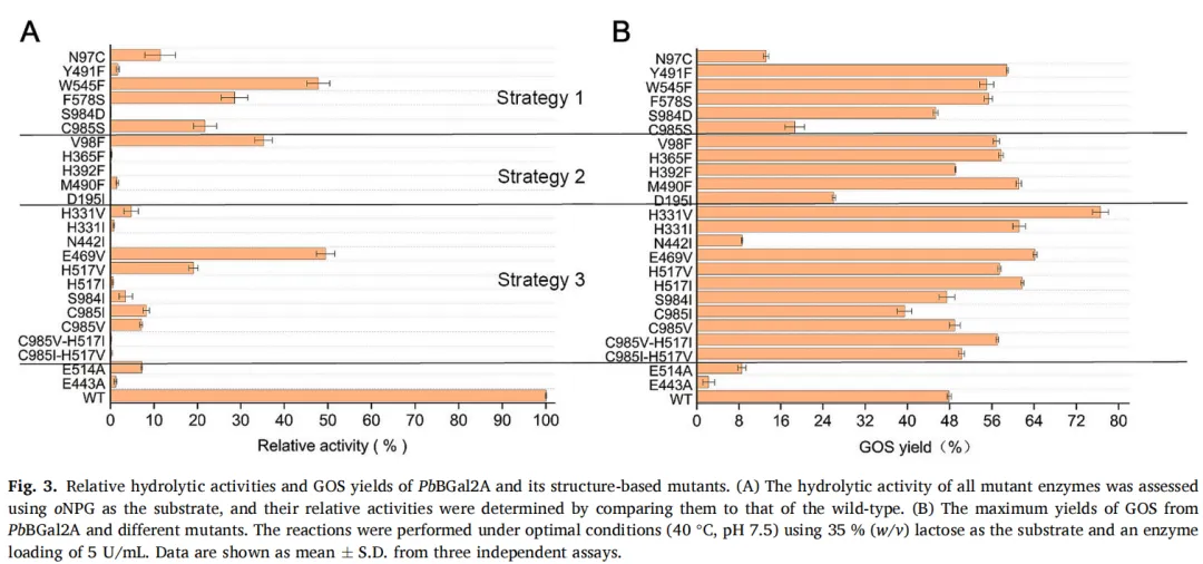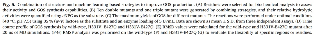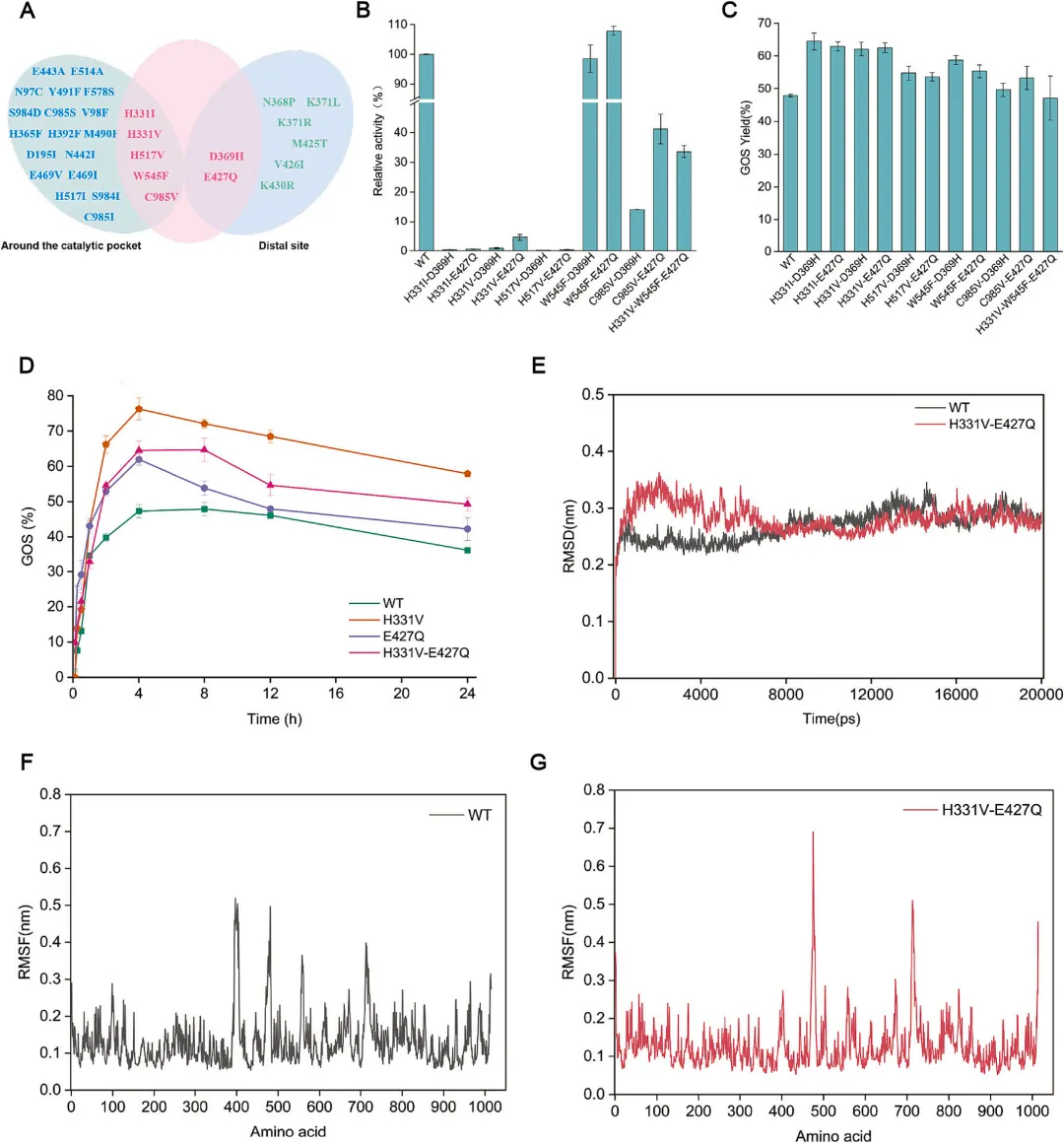 在PbBGal2A结构中,H331和H517可能影响过渡态的形成,而E469可能调节底物进入催化口袋。因此,将这些残基突变为疏水性以排斥水分子,导致GOS合成有更大程度的增加。使用GROMACS2023测定了PbBGal2A的底物结合自由能。与野生型(-31.28 kcal/mol)相比,突变H331V、E469V和H517I导致与乳糖的结合能降低(分别为-13.6、-7.84和-7.317 kcal/mol),表明这些突变倾向于催化转糖基作用而非水解作用。这些结果表明,改造活性位点的氨基酸可以有效增强PbBGal2A生产GOS的能力。
