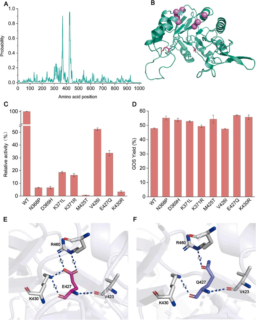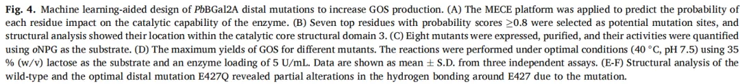 影响蛋白质结构和功能的氨基酸残基遍布整个蛋白质,从活性位点到蛋白质表面。不同研究的数据表明,远端残基通过影响活性位点残基的极性、质子传递特性、静电环境、空间排列和柔性,在酶催化中起着至关重要的作用 。为了识别远离催化中心但可能影响 PbBGal2A 催化效率的残基,应用 MECE 平台预测了每个残基有助于提高催化能力的概率,该平台提供了源自分子进化特征的突变评分指数(图 4A)。选择概率得分≥0.8 的前七个残基作为候选突变位点,以提高 PbBGal2A 的 GOS 合成能力。结构分析表明,这些残基位于催化核心结构域 3 中,距离催化中心约 14 Å(图 4B)。
