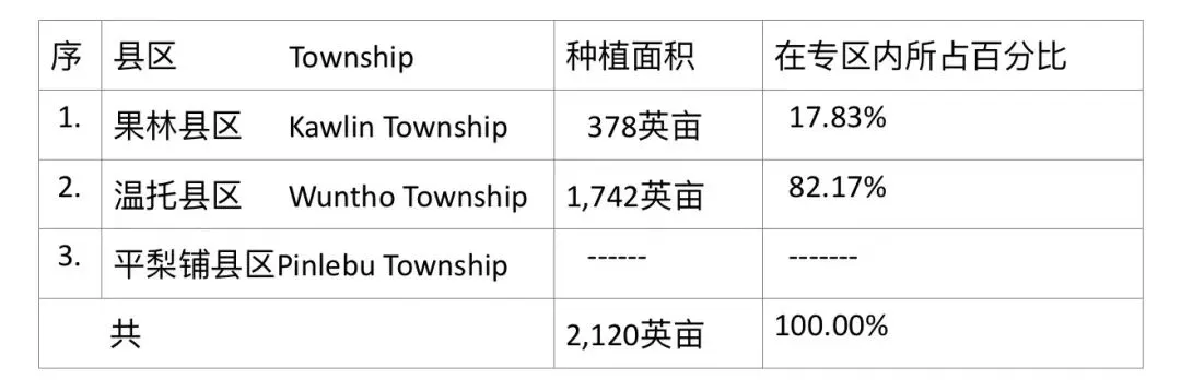 三个县区中,以温托县区这玉蜀黍完成的种植面积为最多,占全专区种植面积五分之四以上比例,而平梨铺县区则完全没有规划种植。而在在雨季期间,果林专区也曾种植了这玉蜀黍1,053英亩。