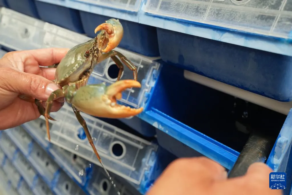 2025年9月2日,在浙江省宁海县一市镇的一家青蟹生产企业,工作人员在暂储青蟹的“蟹公寓”中查看其健康状态。新华社记者 翁忻旸 摄