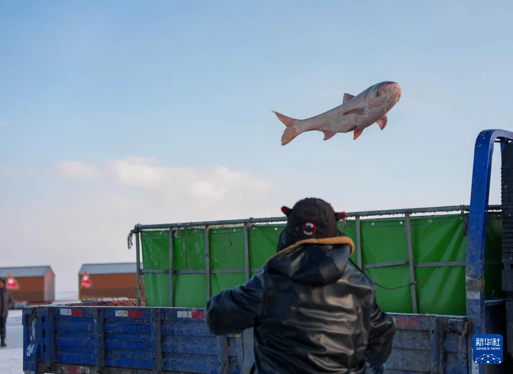 今年1月7日,在吉林省松原市,渔民将刚捕捞的大鱼装进车里。新华社记者 颜麟蕴 摄