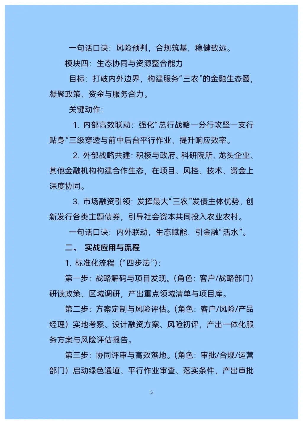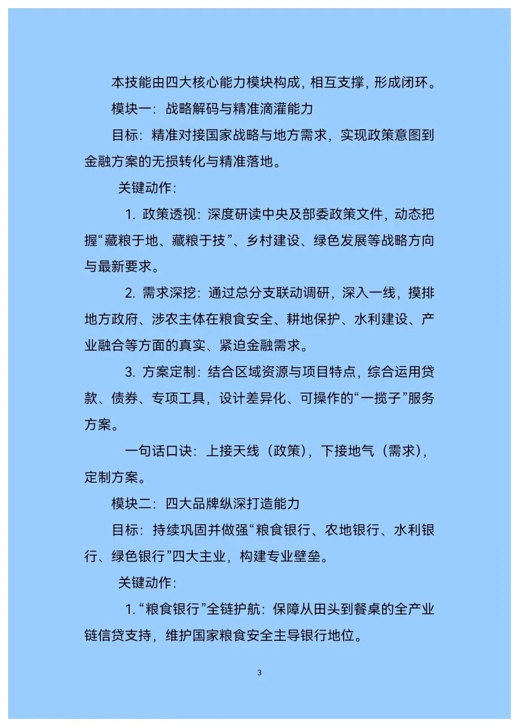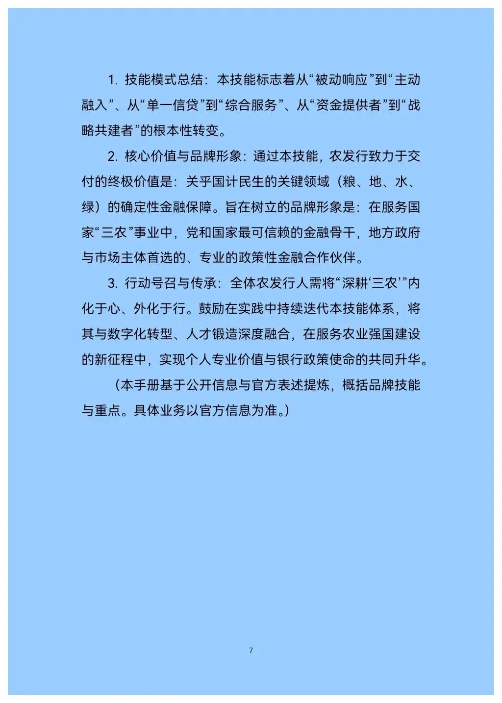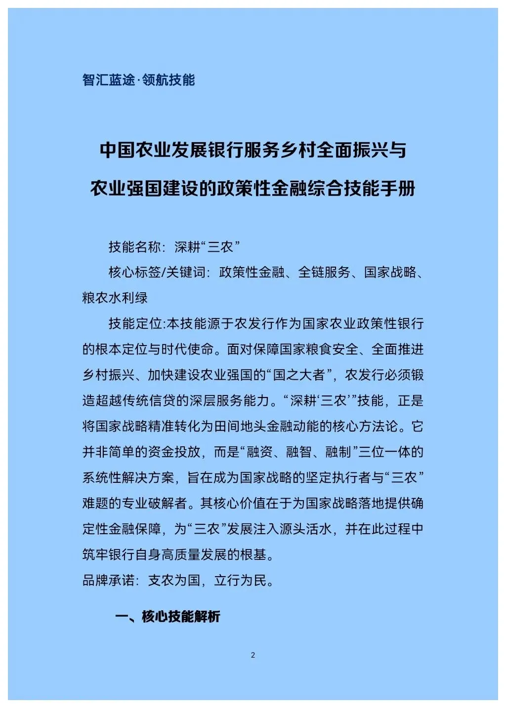 这不仅是一本操作指南,更是一套源于农发行多年实践、系统提炼的“核心算法”。手册首次将政策性银行服务“三农”的深厚积淀,凝练为名为“深耕‘三农’”的可复制、可操作的体系化技能。它标志着从“被动响应”到“主动融入”、从“单一信贷”到“综合服务”的根本性转变。