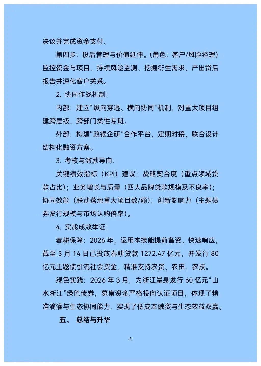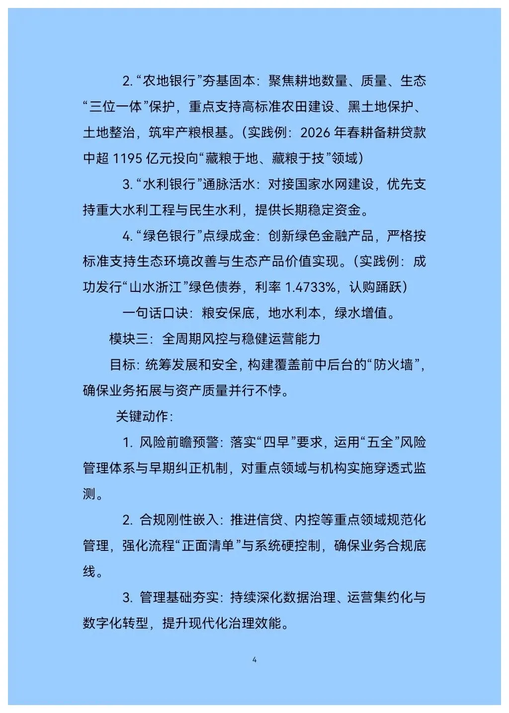 四大品牌纵深打法:聚焦“粮、地、水、绿”四大主业,手册深度解析了如何巩固“粮食银行”、做强“农地银行”、做优“水利银行”、点亮“绿色银行”。内含如2026年春耕超千亿贷款投向分析、“山水浙江”绿债发行实例等鲜活案例,极具参考价值。