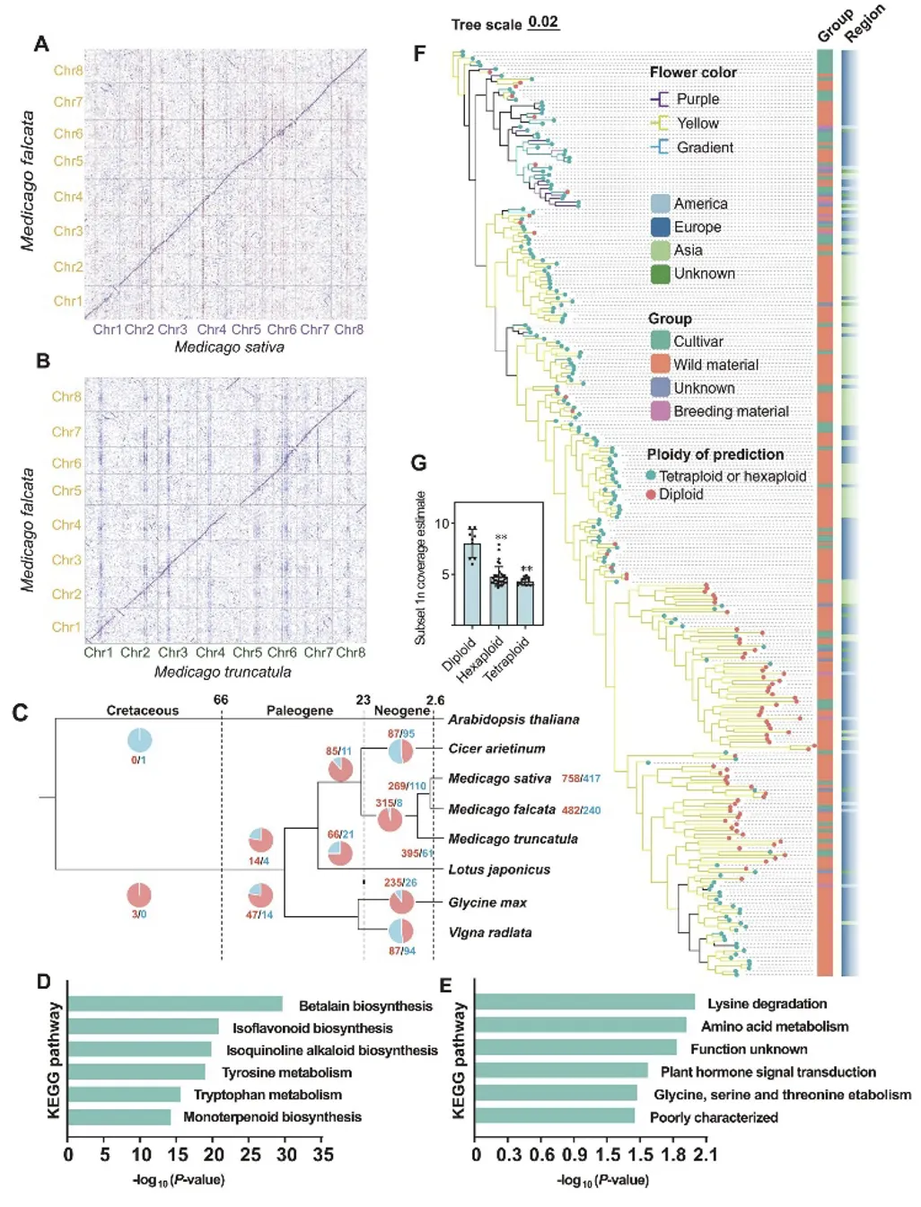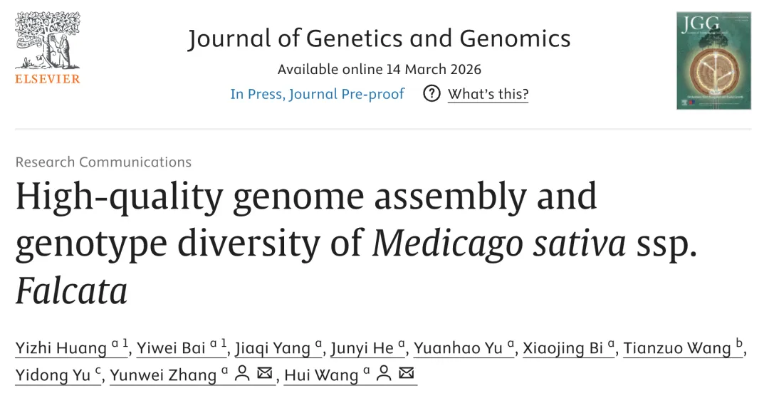 近日,中国农业大学草业科学与技术学院张蕴薇/王慧团队Journal of Genetics and Genomics在线发表题为“High-quality genome assembly and genotype diversity of Medicago sativa ssp. falcata”的研究论文。该研究构建了黄花苜蓿高质量二倍体参考基因组,并完成对271份种质材料的群体遗传分析,为解析其抗逆遗传机制、追溯进化历程提供了重要的基因组资源。