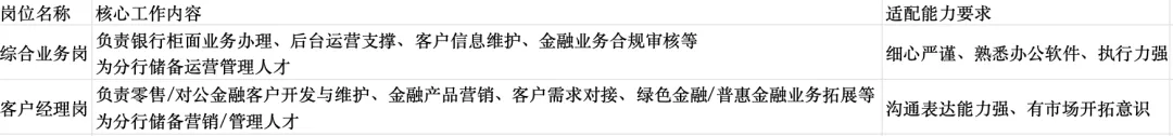 - 适配能力:具备基础金融知识、办公软件操作能力,客户经理岗需具备良好的沟通表达与市场开拓能力。