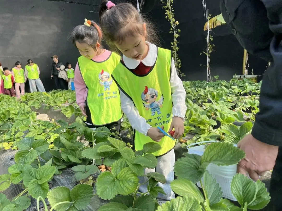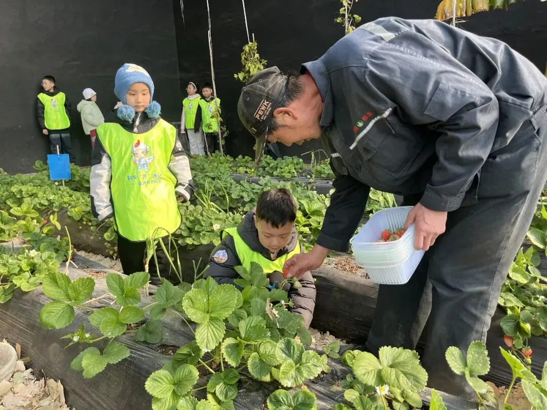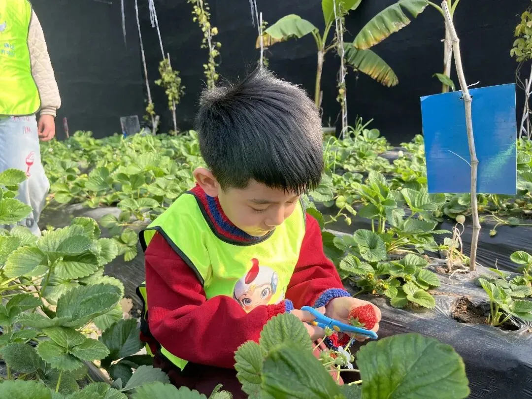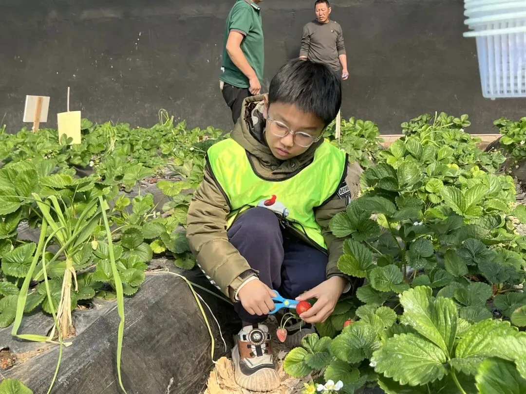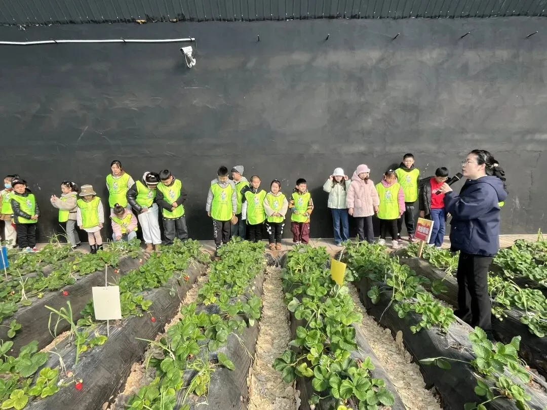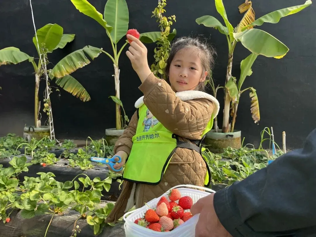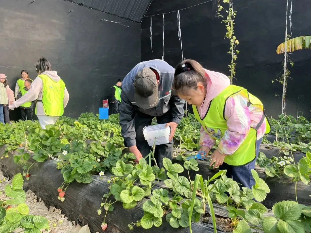 在现代农业科技大棚聆听老师讲解温控灌溉、科学培育等现代农业技术,亲手采摘草莓,在实践中理解科技兴农与生态保护的意义。