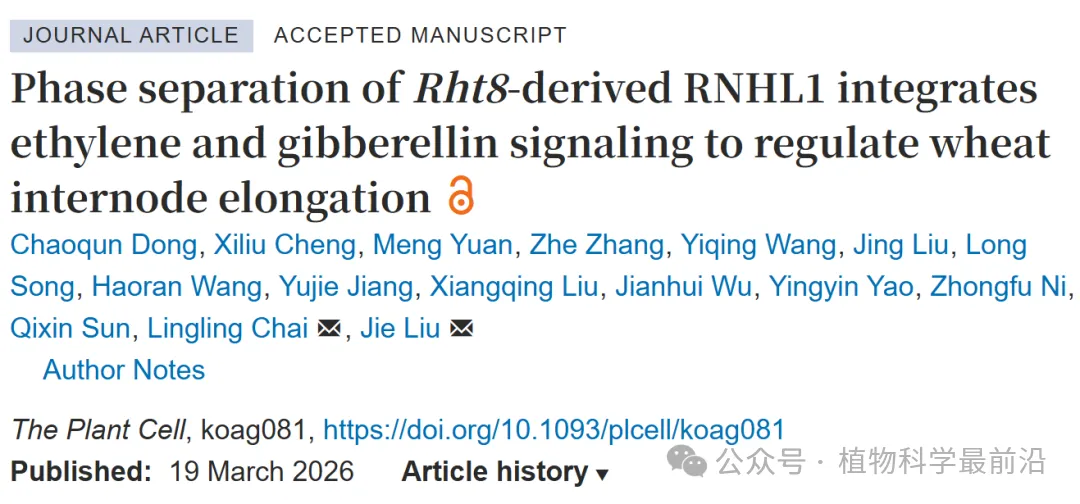2026年3月19日,The Plant Cell在线发表了中国农业大学小麦研究中心题为“Phase separation of Rht8-derived RNHL1 integrates ethylene and gibberellin signaling to regulate wheat internode elongation”的研究论文。该研究系统解析了RNHL1调控小麦株高的分子机制,揭示其通过相分离方式与转录因子TaEIL1在细胞核内互作,协同调控乙烯与赤霉素信号通路,进而精细调控小麦株高和节间伸长。该模型为理解核糖核酸酶H如何与转录因子协同实现基因表达的精准调控提供了新视角。