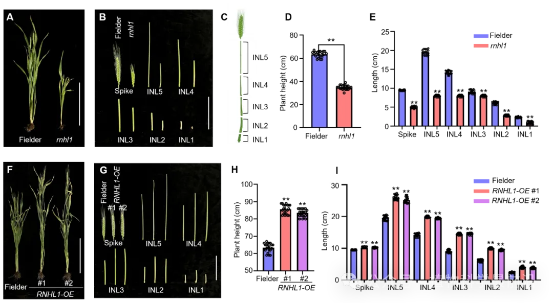 在小麦受体材料“Fielder”中创制了rnhl1敲除突变体(rnhl1-aabbdd),该突变体表现出株高降低、节间缩短以及穗长减小。同时过表达RNHL,与野生型相比,所有RNHL1-OE株系的株高、穗长及节间长度均较野生型显著增加,证明RNHL1正向调控小麦株高(Figure 1)。