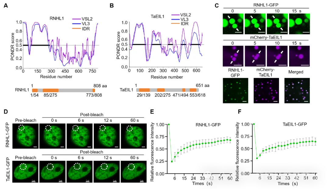 蛋白结构预测结果表明,RNHL1与其互作蛋白TaEIL1均含有多个内在无序区,进一步通过体外相分离实验与荧光漂白恢复实验证明二者确实存在液-液相分离行为(Figure 2)。