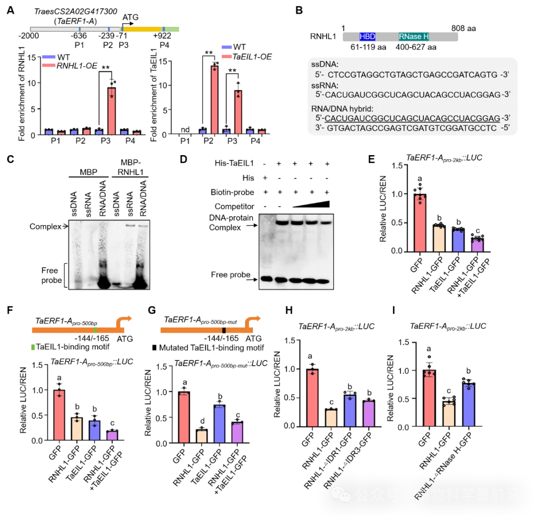 图3 RNHL1与TaEIL1协同调控TaERF1表达