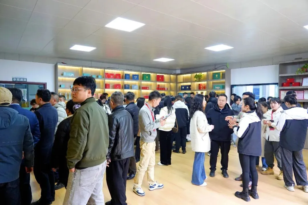 在都匀毛尖茶产业发展(集团)有限公司,考察团实地参观了企业的现代化加工车间和包装车间,详细了解了都匀毛尖名优茶的加工工艺、加工流程、创新技术运用以及市场销售情况。都匀毛尖茶产业发展(集团)有限公司作为贵州省唯一一家“中华老字号”茶企,在海拔1400米的螺蛳壳核心茶产区,拥有1450亩欧标认证有机茶园。公司现有加工厂房面积约2万㎡,其中加工车间8000㎡,冷库2800m³,库房约6000㎡;茶叶生产线7条,精制包装线2条,主要产品有都匀毛尖、都匀红茶、大宗绿茶、茶衍生品(都匀毛尖精酿啤酒、茶饮料、茶香小软茶点、奶茶)。