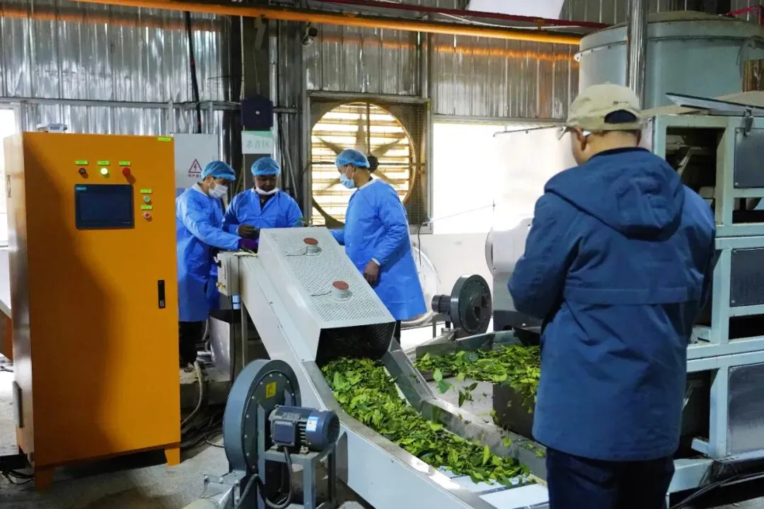在都匀南山茶业有限公司,考察团实地参观了碾茶及精制茶的生产流程。都匀南山茶业有限公司位于都匀毛尖茶核心产区都匀市毛尖镇,现有茶园基地200亩。公司配备完善的茶叶加工厂房、大宗茶生产厂房以及碾茶及精制茶车间,其产品涵盖绿茶、红茶、碾茶、紧压茶及部分农产品。