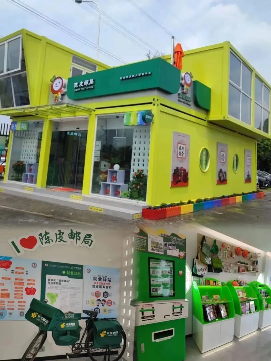 各种年份的新会陈皮、创意无限的邮政文创产品、经典的老式邮递员自行车……位于新会陈皮村的新会陈皮邮局,以独具地方特色的新会陈皮配搭极具创意的邮政产品陈设,吸引着众多游客前来“打卡”。