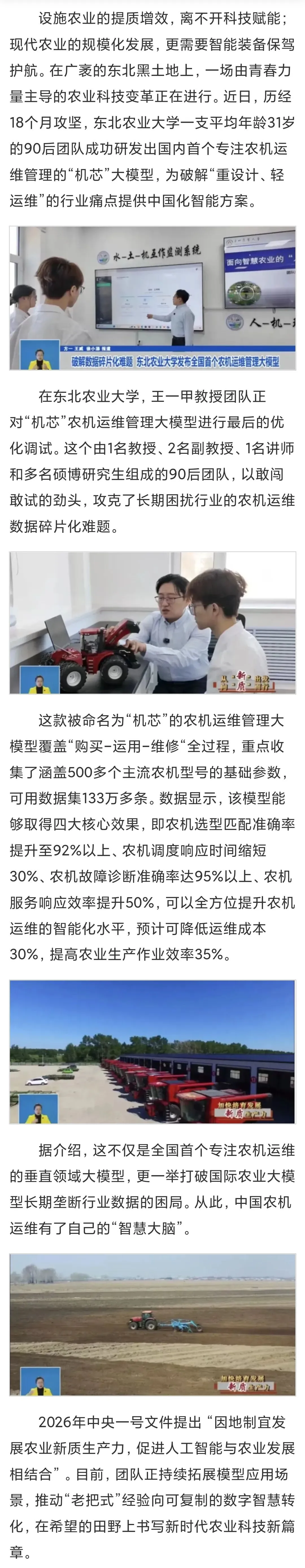 >破解数据碎片化难题 东北农业大学发布全国首个农机运维管理大模型!
