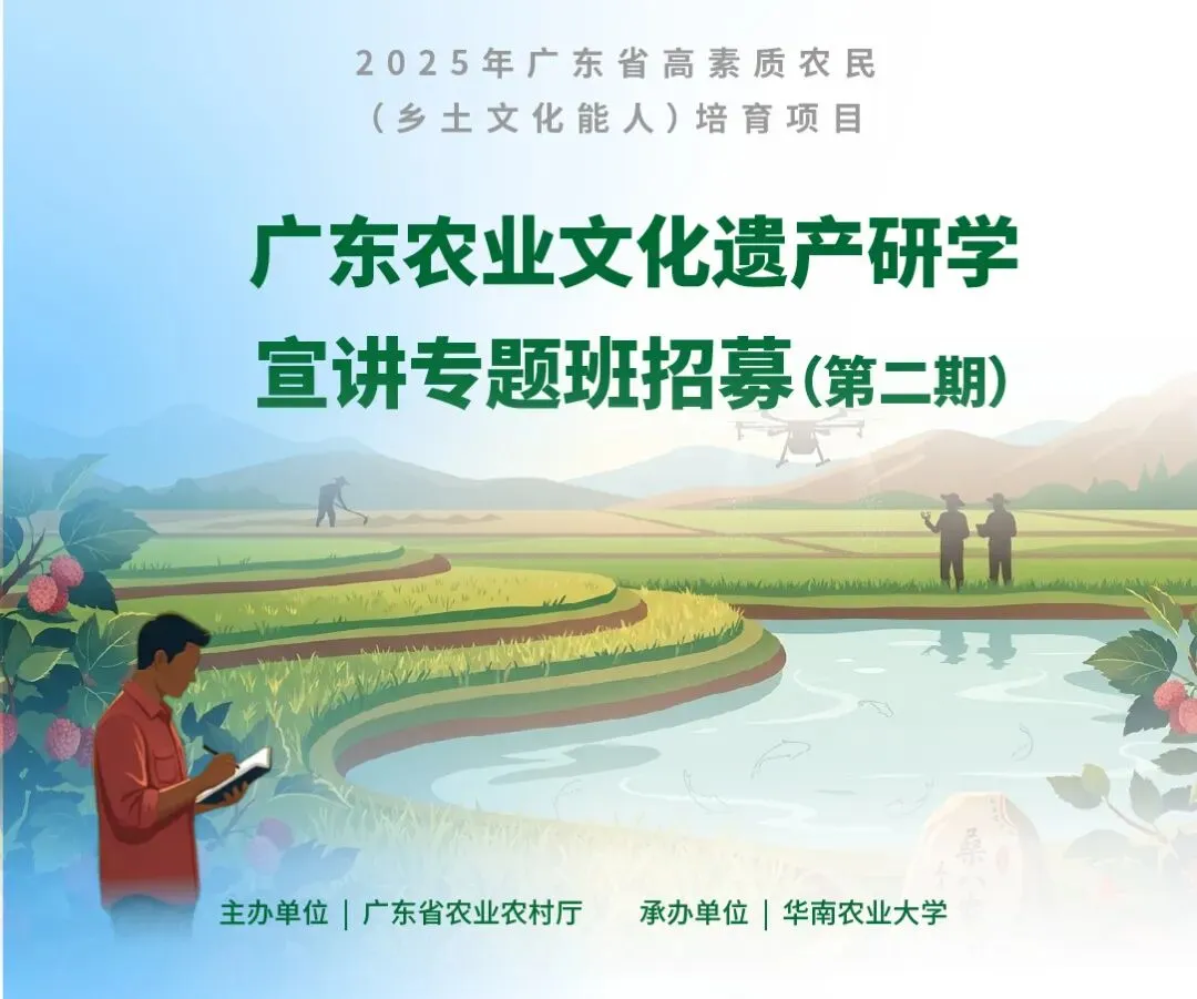 广东省农业文化遗产宣讲专题班(第一期)受到“新农人”热烈追捧,学员参与积极性很高,12天行程,来自全省各地的新农人,不仅观摩了诸多优秀乡村样本,也收获了同学友谊,更学到了诸多宣讲技巧,视频制作,学策划,搞研学,排话剧,文艺赋美乡村!如果说第一期培训是一次关于乡村梦想的初步点燃,那么第二期,我们将迎来一场关于“释放激情”与“文化赋能”的深度旅程。第一期专题班谢幕后,我们见证了太多令人振奋的瞬间。那些沉淀在民间的非遗手艺,在学员们的创意下,赢得了万千粉丝的真诚喜爱;更让人欣慰的是,大家不再是孤独的耕耘者,而是并肩作战的战友。我们共同领略了广东农业文化遗产所蕴含的神奇力量,从剧本构思到现场剪辑,从舞台剧的排练到镜头前的自然表达,大家在实践中真正懂得了:文化,才是农业最高级的表达方式。现在,2025年广东省高素质农民培育项目——乡土文化能人专题班(第二期)正式集结。如果你也想让家乡的故事更有力量,这里就是你的舞台!本次培训拒绝空谈,我们深挖岭南文化根基,为你量身定制了四大核心实战板块:深入研习岭南特色农业文化精髓,探索如何将传统非遗元素转化为具有市场生命力的文创IP,让乡村文化资产“活”起来。资深导师带你玩转短视频全链路:从脚本策划、拍摄运镜到后期精剪。特别增设舞台剧编排与表演实训,让你在镜头前不仅有底气,更有张力。学习如何通过创意文案为农产品“塑魂”,掌握跨界营销技巧,让你的产品在激烈的市场竞争中凭借文化底蕴实现品牌溢价。走出教室,深入省级标杆基地,实地观摩那些成功的文化致富案例,在对话中碰撞出属于你的破局思路。名师坐镇: 邀请农业农村部专家、知名文化学者及短视频实操大咖联合授课。资源聚拢: 全省各地的文化能人结为同窗,构建乡村振兴的互助生态圈。应更多地市新农人的要求~“新农人”培训第二期又开始了!报名截止日期4月5日,4月7日开始进入第二期培训。课程全新升级,优化研学流程,增加科技赋能内容,农商资源对接,把文化写入田间地头,助力新乡村建设!为了保证学习效果,请各位意向学员仔细阅读以下安排:报名要求: 诚邀广东省内的家庭农场主、合作社骨干、乡村非遗传承人及返乡创业青年加入。福利政策: 本项目属政府公益培训,学费全免,食宿由主办方统一安排(往返交通费自理)。培训周期: 2026年4月7日 — 4月19日(共计12天)。授课地点: 广州市天河区华南农业大学、增城六大实践基地(具体报到地点将另行通知)。报名方式,点开链接扫码。开始你的新农人探索文化非遗之旅!★ 截止时间: 请务必于 2026年4月5日 18:00 前完成申请。★ 线上预约: 扫描下方二维码填报。按要求填写报名表,并录制一段3分钟左右的自我介绍视频(内容包括姓名、哪个村、有什么特长或才艺等等),让我们充分了解你的学习想法和特长。★ 资料提交: 报名成功后,请及时将相关证明材料发送至指定邮箱:rwxy@scau.edu.cn(邮件按“姓名+农业文化遗产研学宣讲”命名),视频将作为录取的重要依据。★ 限制条件:已参加2025年度高素质农民培育项目的人员不可重复报名。培训需求填写“乡土文化能人”;意向培训机构填写“华南农业大学”扫码填写提交报名表+邮件成功发送才艺视频才视为报名成功。我们在第二期专题班,期待与你共同见证乡土文化的“神奇力量”!#新农人培训#农业文化遗产#投资与人#农业人才#乡土文化#乡村振兴#百千万工程#省农业农村厅#华南农业大学#农业研学关于广东省农业文化遗产宣讲专题班