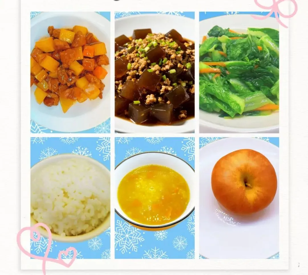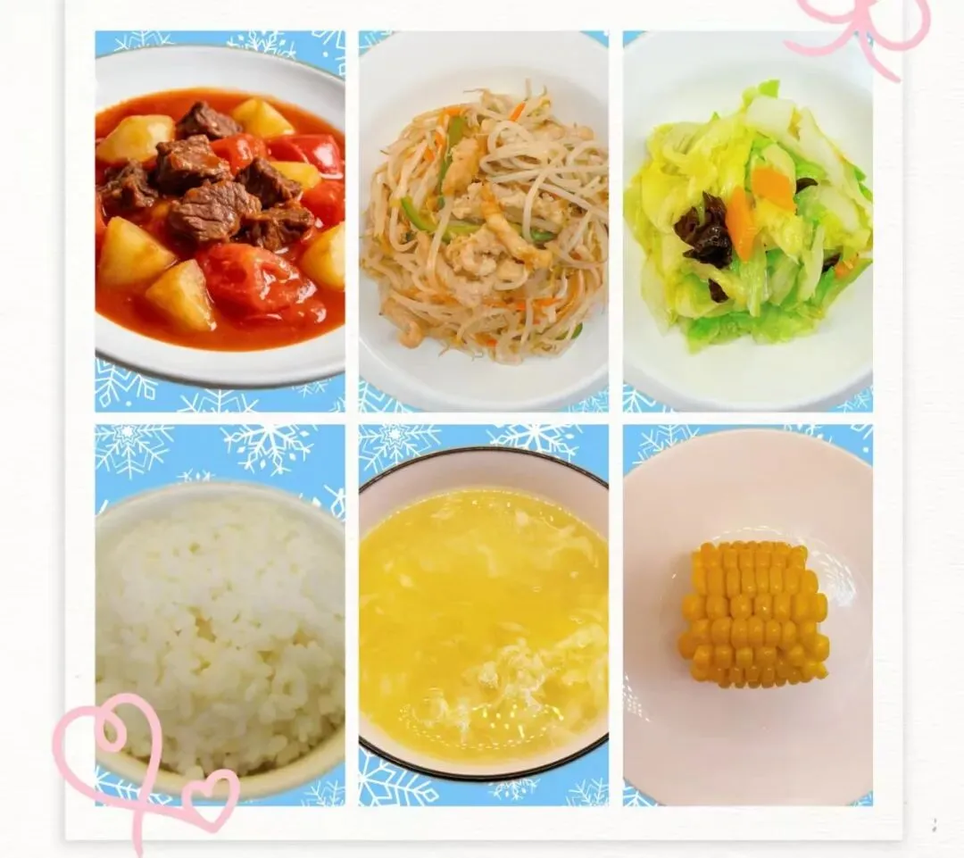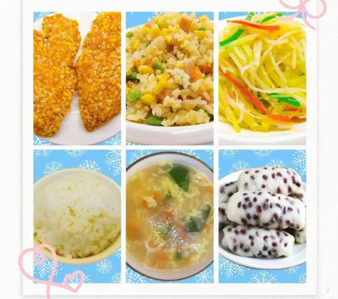什锦炒饭:鸡蛋30g,胡萝卜末20g,玉米粒20g,青豆20g,香葱末5g,培根丁30g;