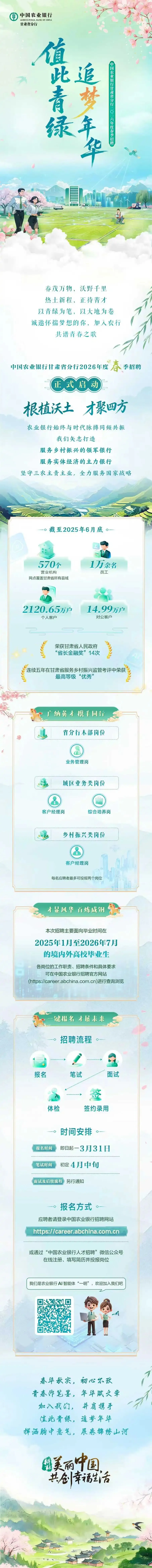 中国农业银行甘肃省分行2026届春季校园招聘