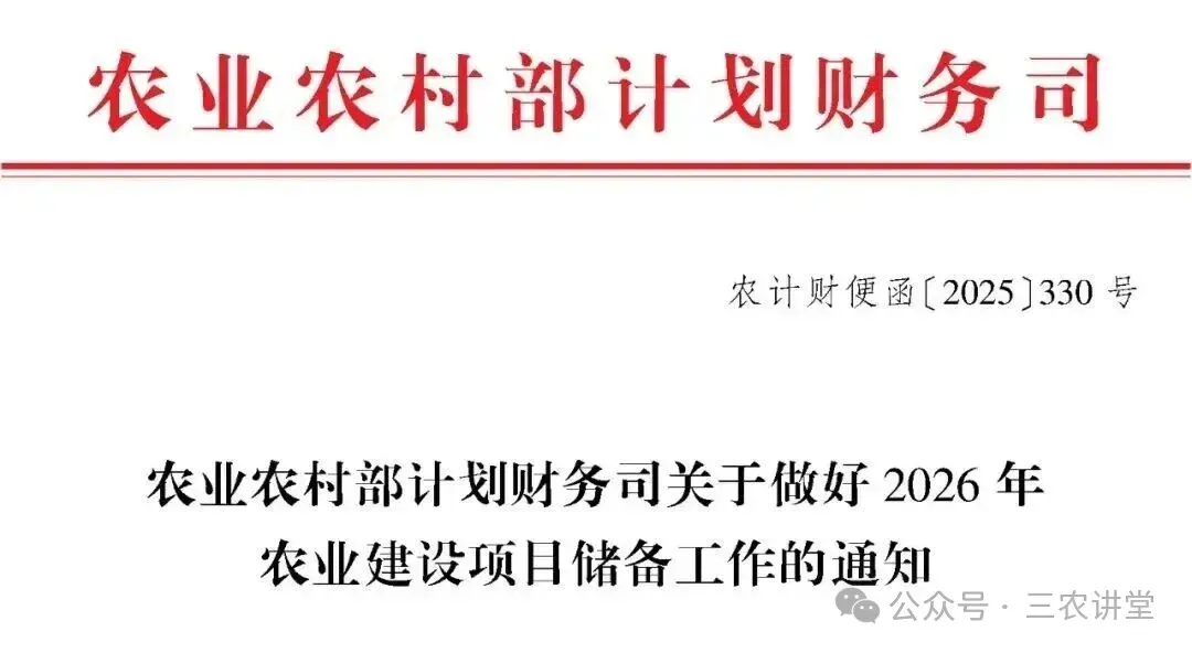 农业农村部计划财务司印发了《关于做好2026 年农业建设项目储备工作的通知》(农计财便函〔2025〕330 号)【点击查看原文】