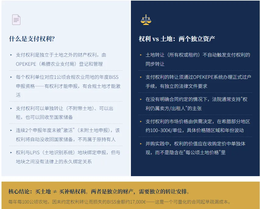 这不是一个边缘案例。在希腊农业资产交易中,支付权利与土地的分离,是比产权瑕疵更常见的争议来源。本篇文章的目的,就是把这个问题讲清楚:支付权利是什么法律性质(见图1)、三种常见转让情形下的权利归属如何判断、并购前必查的15项尽调清单,以及合同应该如何保护买方权益。
