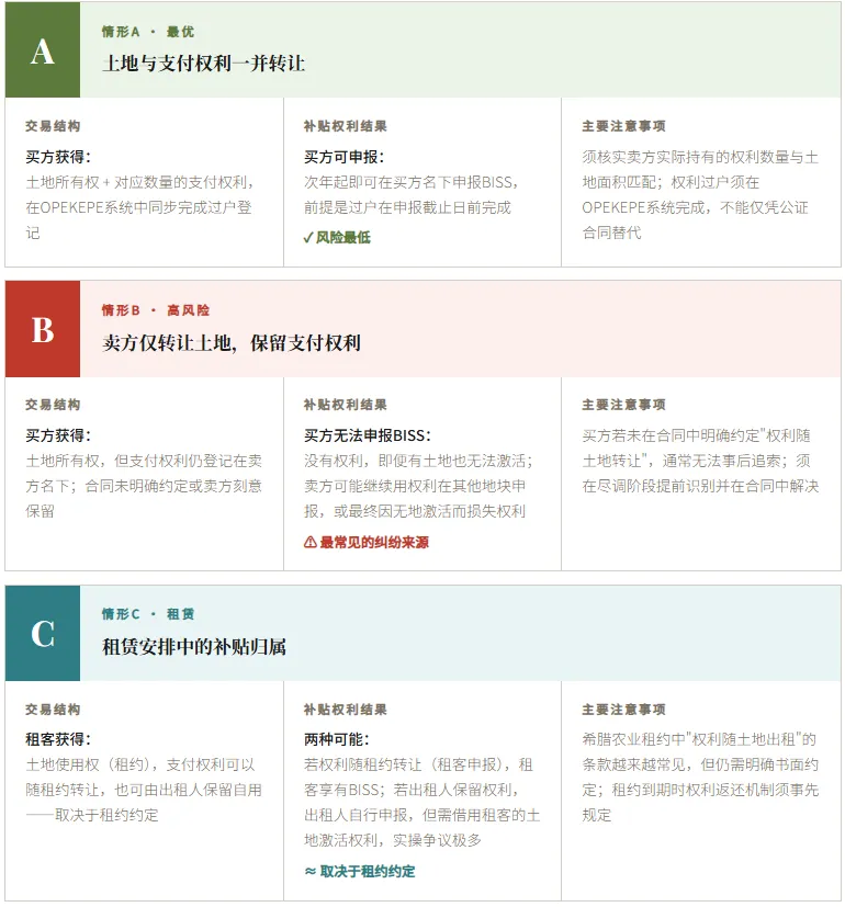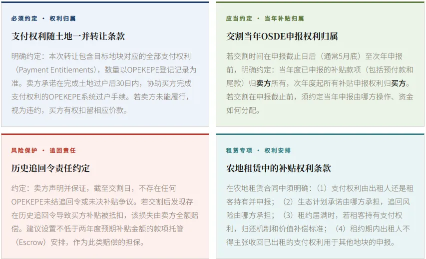 数据来源: Regulation (EU) 2021/2115 Art.23–26(支付权利法律框架);Regulation (EU) 1307/2013 Art.34(权利转让历史规则);OPEKEPE支付权利管理操作指南(opekepe.gr);希腊Civil Code Art.513–543(租赁法律框架);欧希财经农业并购顾问实践案例整理(2022–2024)