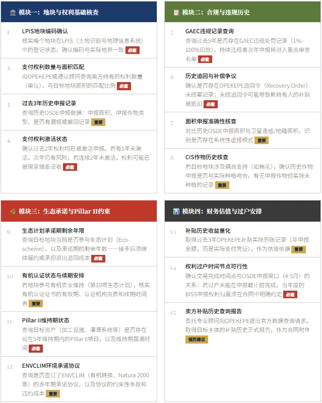在进入正式谈判之前,针对农业资产的补贴相关尽调应覆盖以下15项核查内容。这份清单按照风险优先级分为四个模块: