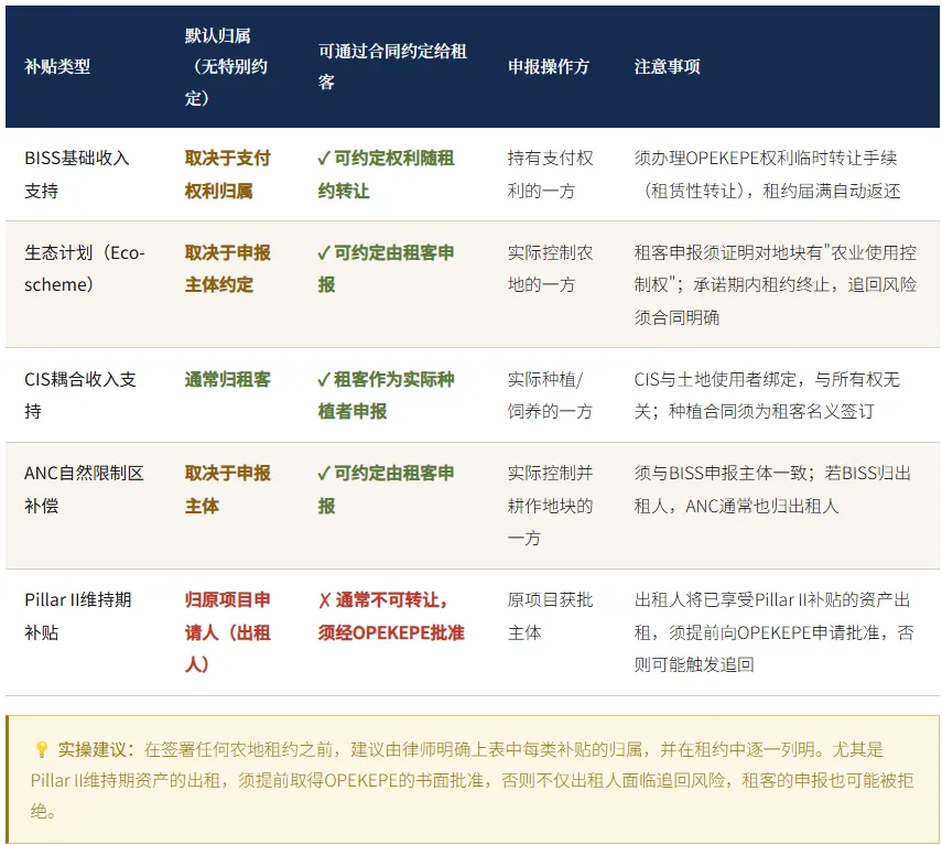 对于通过租赁(而非购买)持有希腊农地的投资者,以下矩阵呈现了不同租约安排下各类补贴的归属状态: