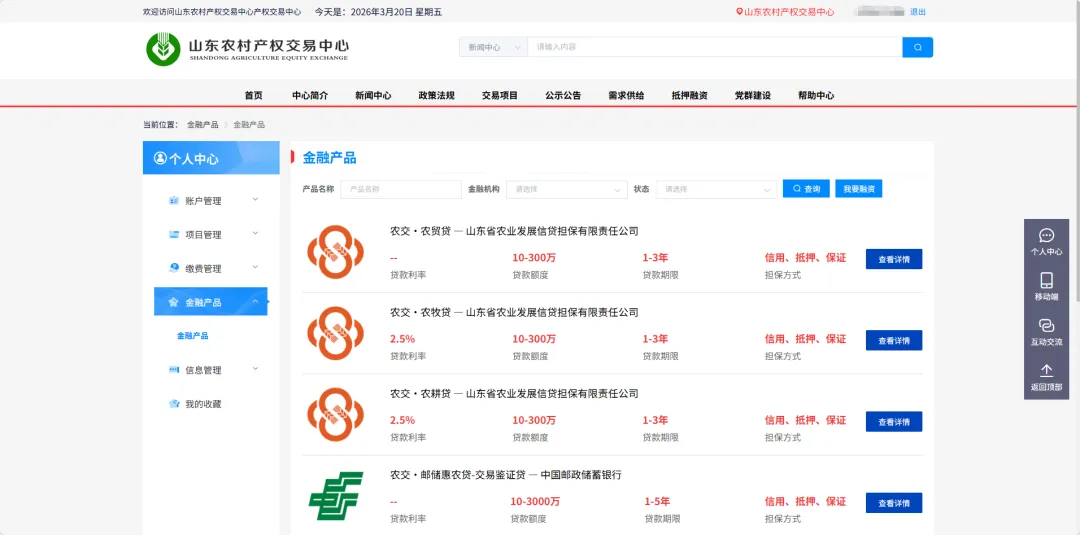 依托山东农交中心官网“个人中心”,双方联合上线农交·农贸贷、农交·农耕贷、农交·农牧贷三款专属金融产品,精准覆盖农产品贸易、粮食生产、畜禽养殖等重点领域。产品以信用免抵押、审批高效、综合费率低为特色,精准匹配农户与新型农业经营主体融资需求,显著降低融资门槛,提升信贷可得性,是农业金融服务精准化、普惠化的重要实践。