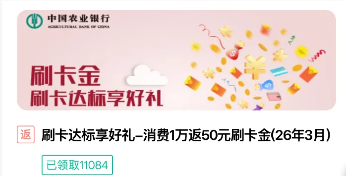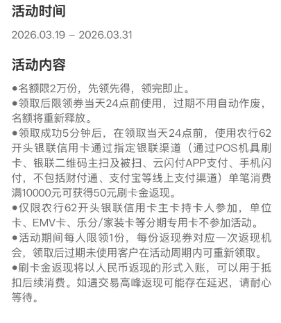 活动时间:2026年3月19日至2026年3月31日活动内容:活动期间,领取成功5分钟后,在领取当天24点前,使用农行62开头银联信用卡通过指定银联渠道(通过POS机具刷卡、银联二维码主扫及被扫、云闪付APP支付、手机闪付,不包括财付通、支付宝等线上支付渠道)单笔消费满10000元可获得50元刷卡金返现。活动入口:农业银行APP-信用卡-热门活动-刷卡达标享好礼-消费1万返50元刷卡金(26年3月)
