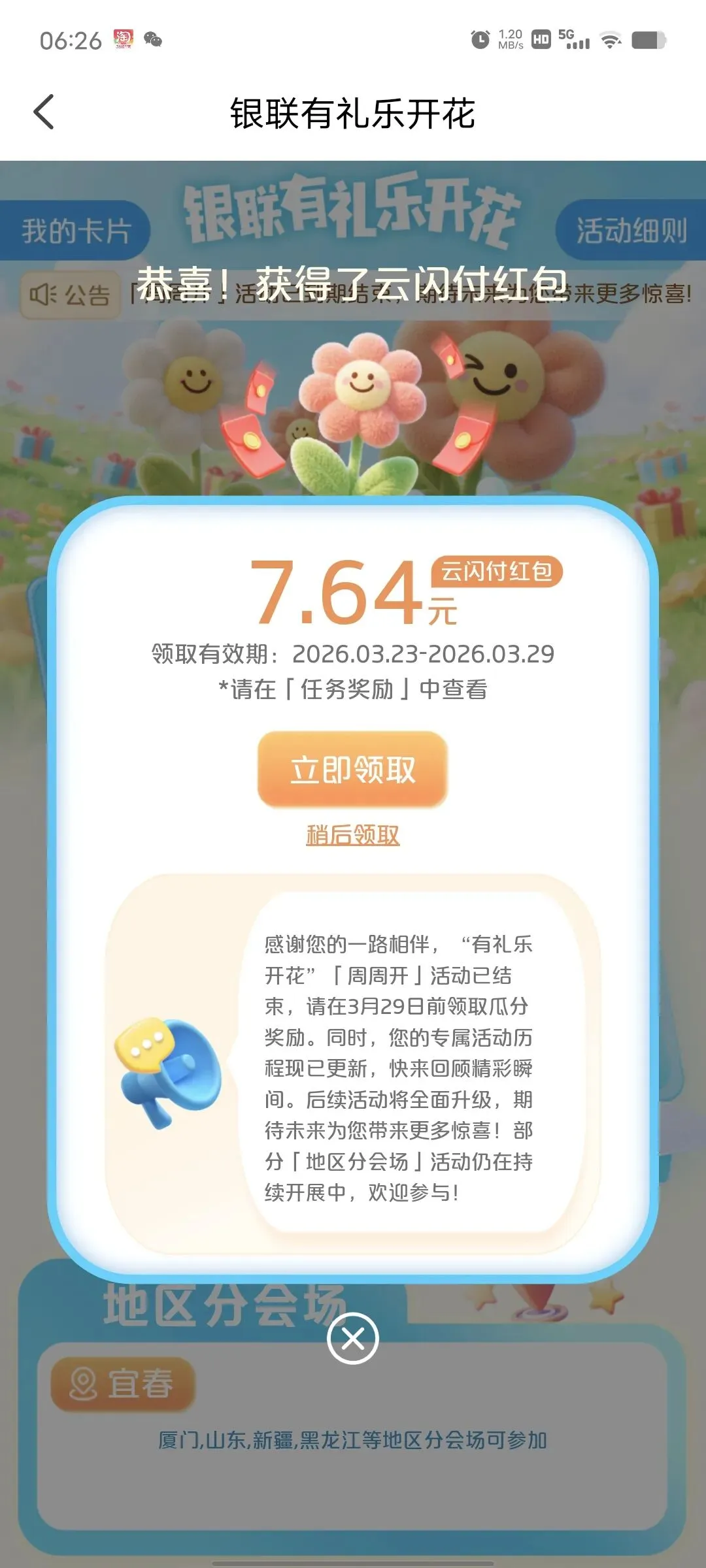 云闪付有礼乐开花记得去领红包,最后一次了,这活动没有了真的可惜,每个星期都能撸8块左右。