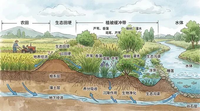 将面源污水中的氮、磷等营养物再度进入农作物生产系统,为农作物提供营养,达到循环再利用的目的。例如无锡市胡埭镇通过生态沟、净化塘等组合系统,净化农田退水后,通过末端节制闸实现循环回用。浙江平湖更是创建了稻田退水“零直排”模式,核心区氮磷排放削减达18%~24%,真正实现了“肥水不流外人田”。🌿2.4 生态修复(Restore):末端的水体疗愈