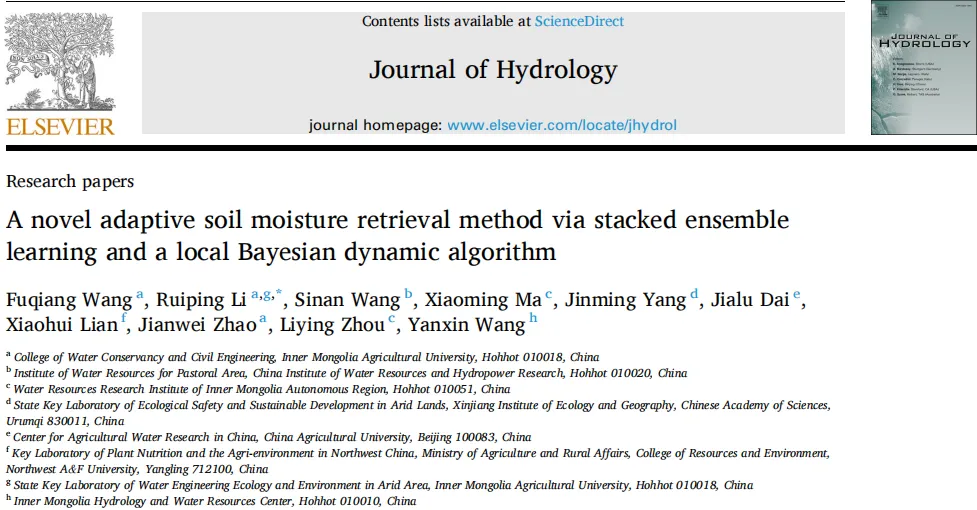 近日,内蒙古农业大学旱区水工程生态环境全国重点实验室李瑞平教授团队在水文学与水资源领域国际期刊《Journal of Hydrology》(中科院1区Top)发表题为“A novel adaptive soil moisture retrieval method via stacked ensemble learning and a local Bayesian dynamic algorithm”的研究论文。李瑞平教授为通讯作者,内蒙古农业大学为第一完成单位。