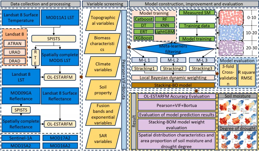 本研究提出的局部贝叶斯动态加权堆叠集成学习模型,结合对象级处理策略增强型时空自适应反射融合模型和多层级特征筛选方法构建的框架可以显著提高多层土壤水分反演精度,能够实现盟或市域尺度土壤水分精细化监测,为干旱半干旱地区水资源管理和干旱预防治理提供参考。