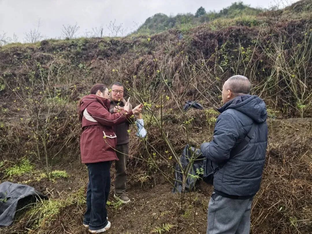 省级科技特派员到小围寨街道普林村吴茱萸中药材种植基地开展技术指导服务,市农业农村局相关同志陪同。