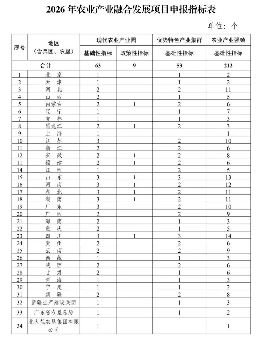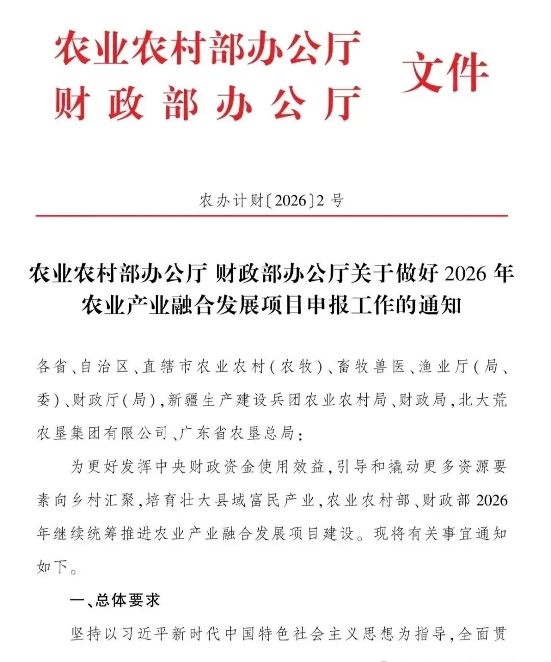 农业农村部办公厅与财政部办公厅联合下发《关于做好2026年农业产业融合发展项目申报工作的通知》农办计财〔2026〕2号,聚焦国家现代农业产业园、优势特色产业集群、农业产业强镇三大类型项目,通过中央财政资金引导,撬动各类资源要素向乡村汇聚,培育壮大县域富民产业。现代农业产业园:各省份应至少申报1个重点品类项目,且申报产业园农业全产业链产值应达到20亿元,全部作为竞争遴选项目申报。优势特色产业集群:各省份应向重点品类聚焦,全部作为竞争遴选项目申报。 原则上2024年农林牧渔业总产值超过4000亿元的省份,申报产业全产业链产值应达到100亿元;低于4000亿元的省份,申报产业全产业链产值应达到80亿元(新疆、西藏应达到50亿元) 。 各省优势特色产业集群项目应合理布局、适度集中,覆盖区域不超过两个地级市,有条件的可集中在一个地级市布局申报。农业产业强镇:原则上东、中、西部地区镇域申报主导产业全产业链产值应分别达到2亿元、1.5亿元和1亿元,采取地方择优竞争、部级层面组织书面审查的方式开展申报,并将抽取50%左右比例的项目采取答辩等方式进行复核。近两年发生重大农业环境污染或生态破坏问题、重大农产品质量安全事件、严重挤占挪用涉农资金等重大财政资金违纪违规事件,被省级及以上生态环境、农业农村、市场监督管理或财政等部门通报的县市,均不得纳入申报范围。