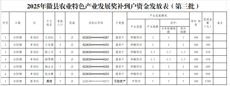 按照中共徽县农村领导小组(徽县实施乡村振兴战略领导小组)《关于印发徽县2025年农业特色产业发展奖补办法的通知》徽农领发〔2025〕6号文件精神,现将2025年水阳镇农业特色产业发展奖补资金发放册(到户)予以公示,接受广大干部群众监督,如有异议请从即日起5个工作日向水阳镇人民政府反映。